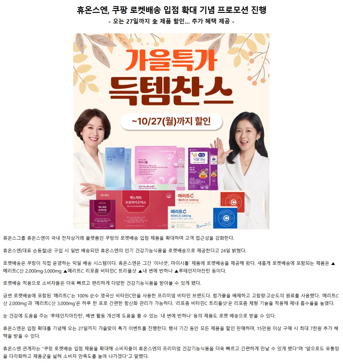 휴온스엔, 쿠팡 로켓배송 입점 확대 기념 프로모션 진행 - 오는 27일까지 全 제품 할인… 추가 혜택 제공 ..