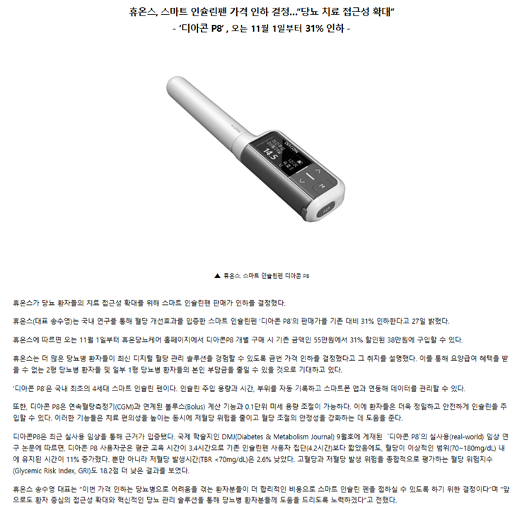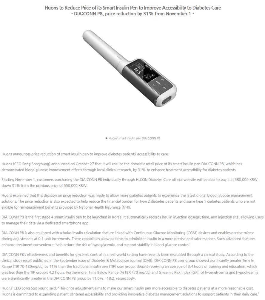 휴온스, 스마트 인슐린펜 가격 인하 결정…”당뇨 치료 접근성 확대” - ‘디아콘 P8’ , 오는 11월..