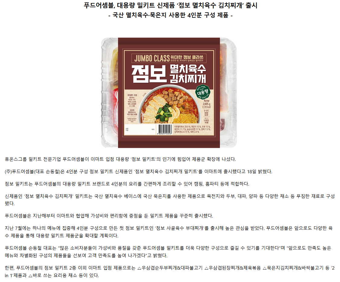 푸드어셈블, 대용량 밀키트 신제품 ‘점보 멸치육수 김치찌개’ 출시 - 국산 멸치육수·묵은지 사용한 4인..