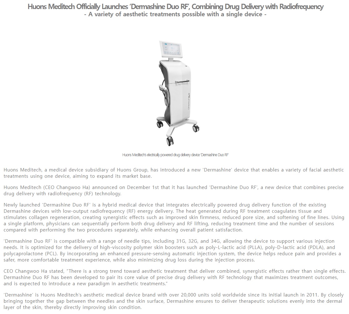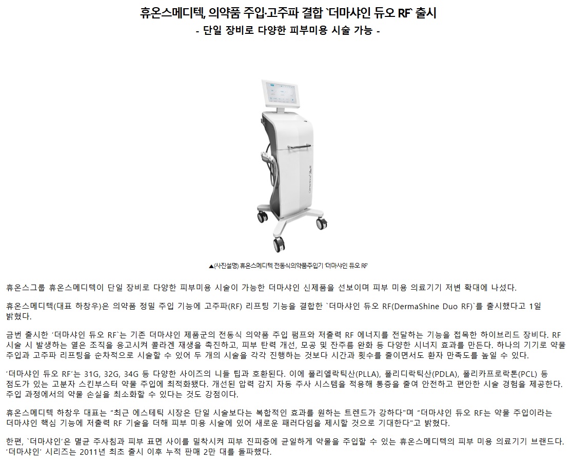 휴온스메디텍, 의약품 주입·고주파 결합 `더마샤인 듀오 RF` 출시 - 단일 장비로 다양한 피부미용 시술 가능 - ..