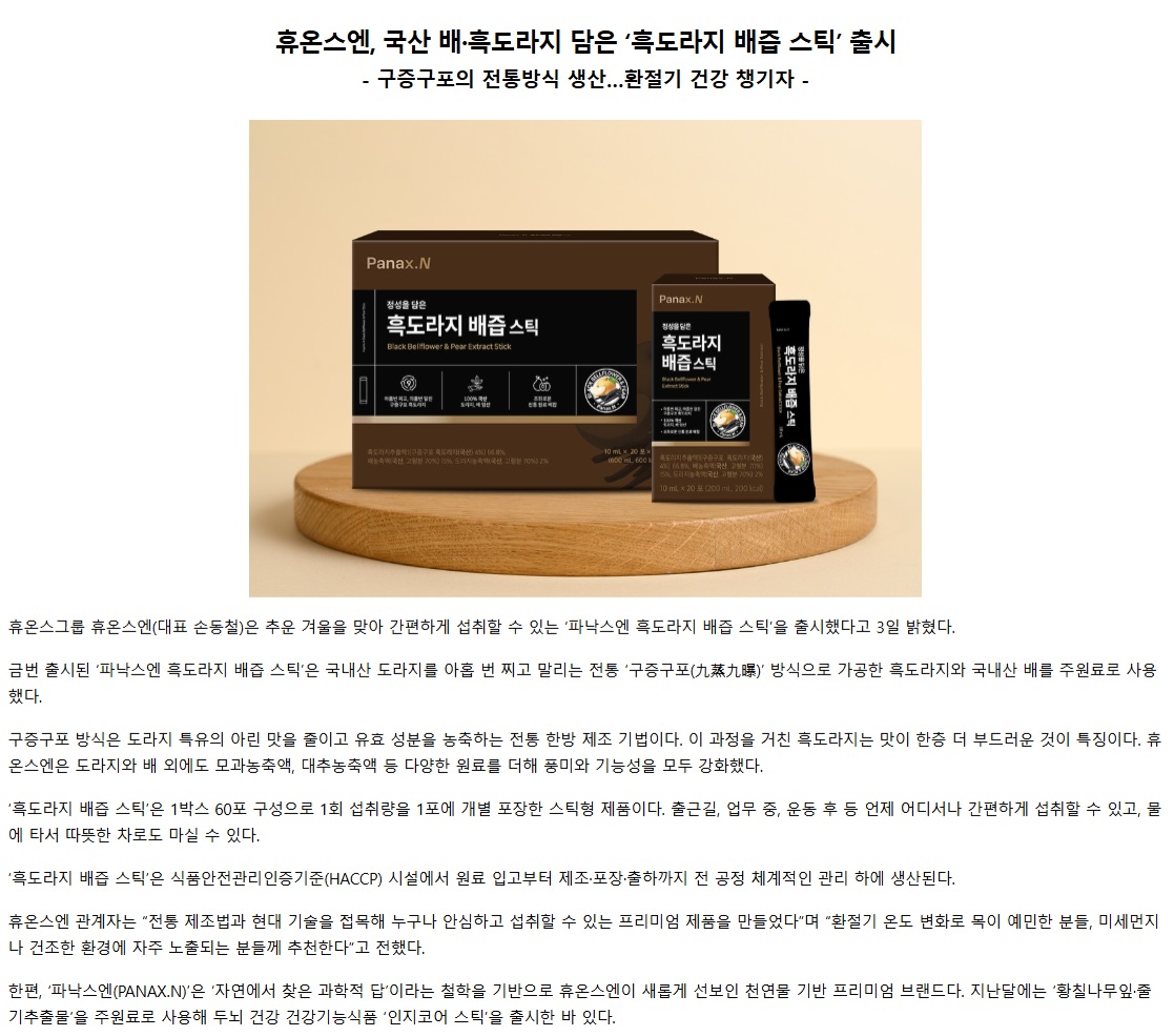 휴온스엔, 국산 배·흑도라지 담은 ‘흑도라지 배즙 스틱’ 출시 - 구증구포의 전통방식 생산…환절기 건강..