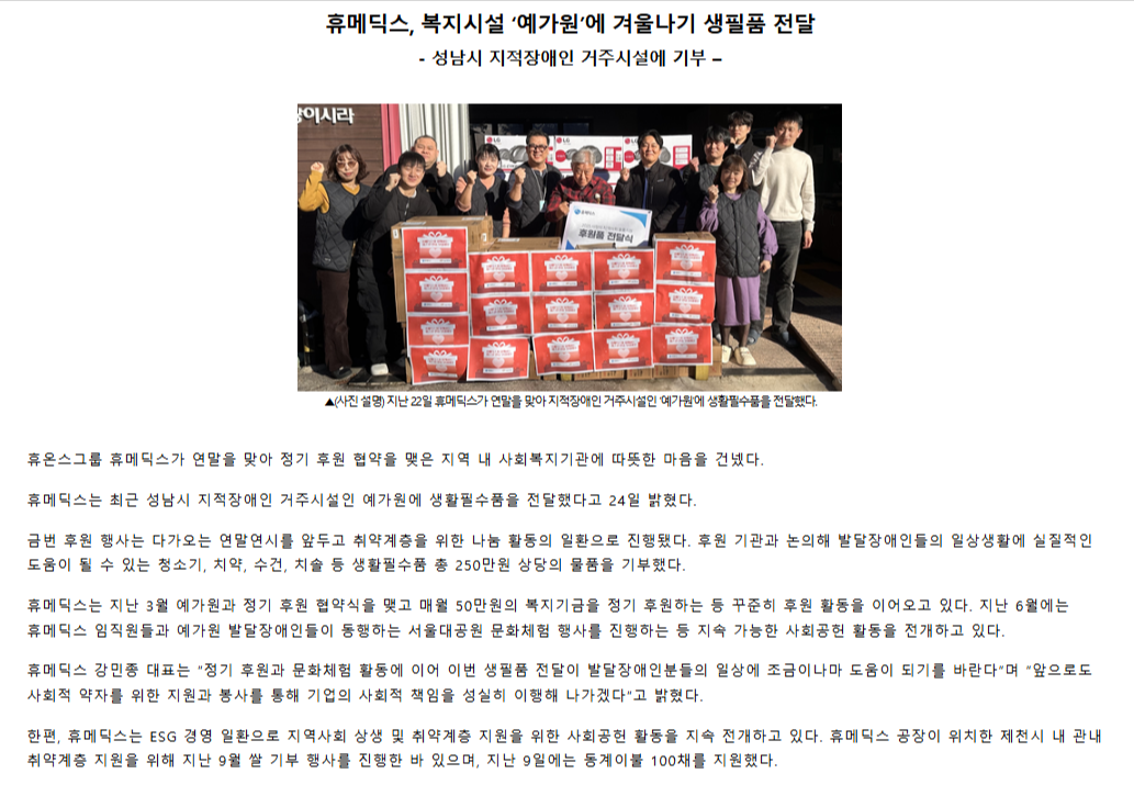 휴메딕스, 복지시설 ‘예가원’에 겨울나기 생필품 전달 - 성남시 지적장애인 거주시설에 기부 – ..