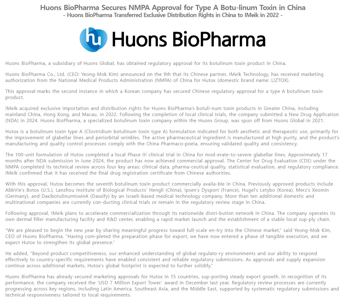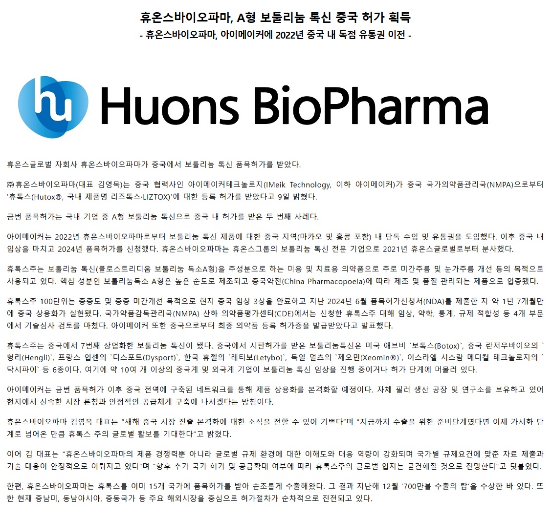 휴온스바이오파마, A형 보툴리눔 톡신 중국 허가 획득 - 휴온스바이오파마, 아이메이커에 2022년 중국 내 독..