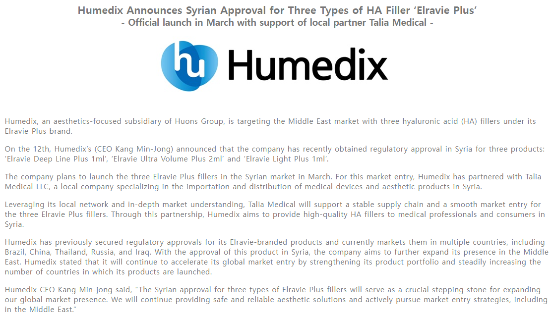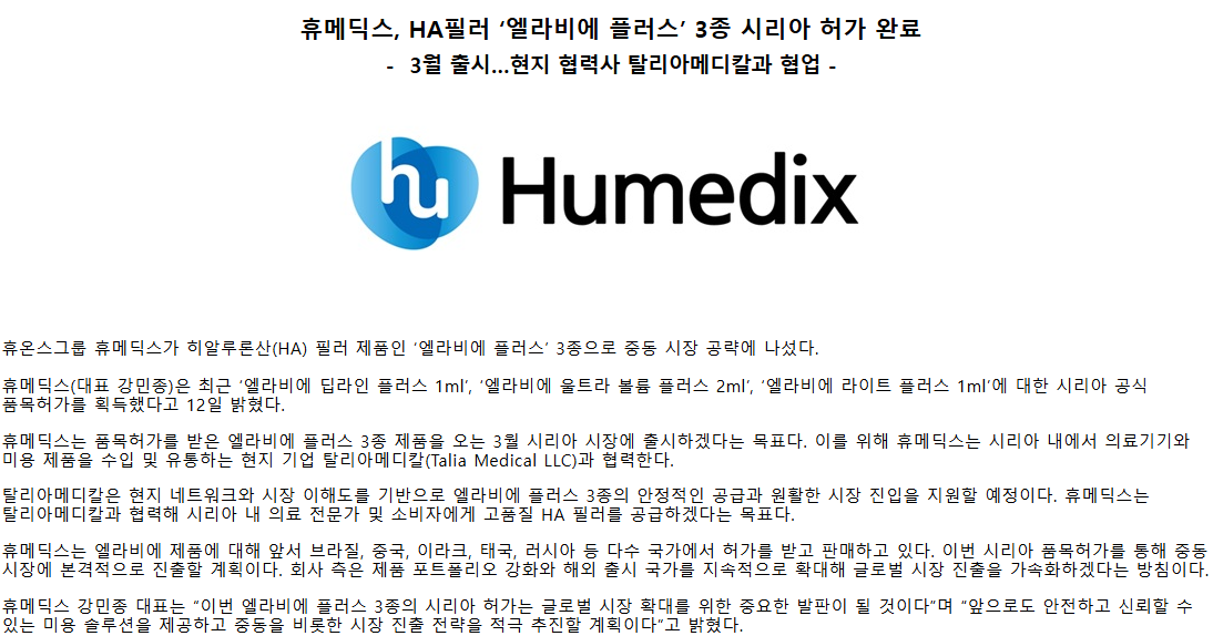 휴메딕스, HA필러 ‘엘라비에 플러스’ 3종 시리아 허가 완료 - 3월 출시…현지 협력..