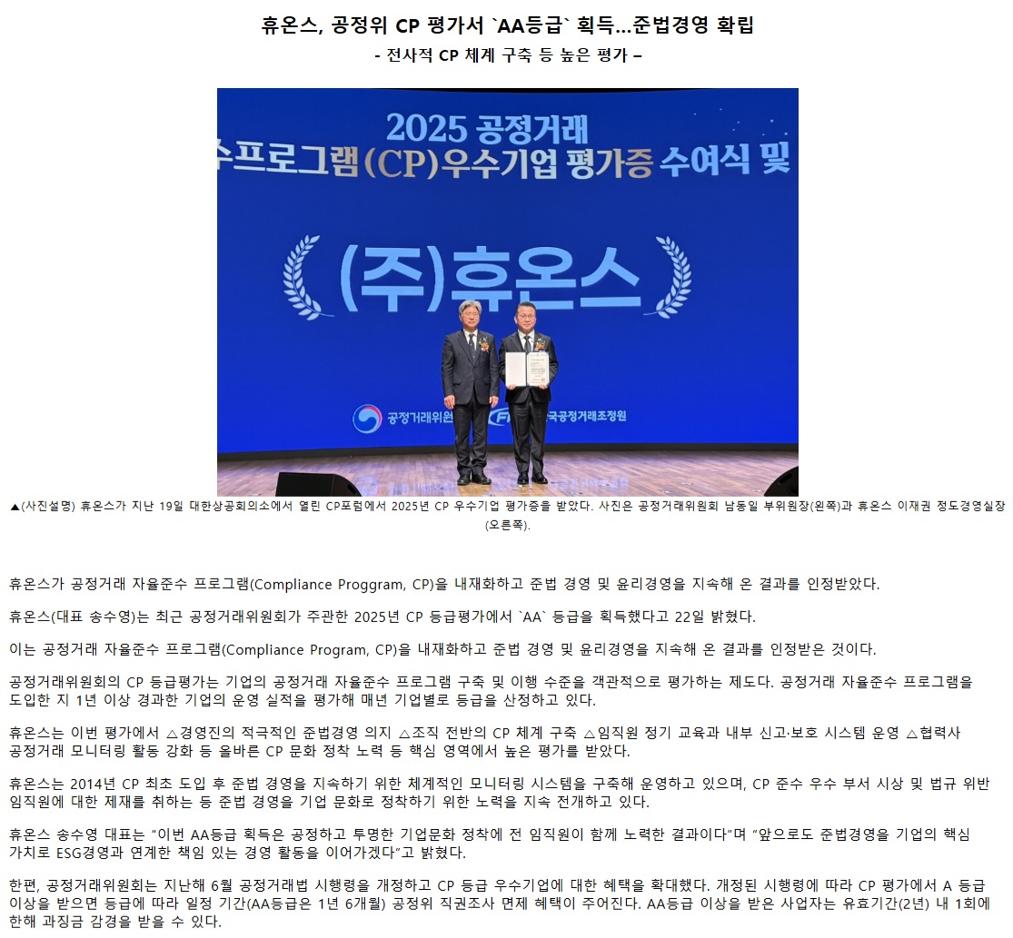휴온스, 공정위 CP 평가서 `AA등급` 획득…준법경영 확립 - 전사적 CP 체계 구축 등 높은 평가 –  ..