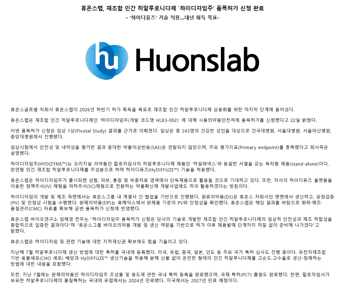 휴온스랩, 재조합 인간 히알루로니다제 `하이디자임주’ 품목허가 신청 완료