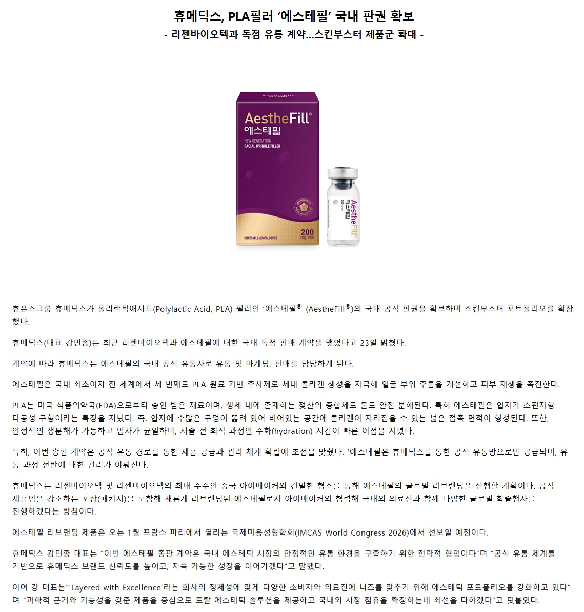 휴메딕스, PLA필러 ‘에스테필’ 국내 판권 확보 - 리젠바이오텍과 독점 유통 계약…스킨부스터 제품군 확..