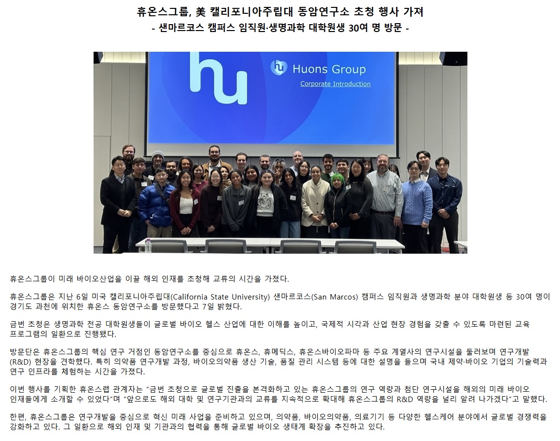 휴온스그룹, 美 캘리포니아주립대 동암연구소 초청 행사 가져 - 샌마르코스 캠퍼스 임직원·생명과학 대학..